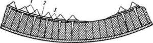 При навеске цепей гирляндами их крепят обоими концам» так, что крепление концов смещается по винтовой линии. При этом цепи свисают до оси или несколько ниже.