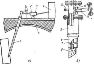 Газоотборная труба (б) состоит из установочной трубы 9, паровой рубашки 8, газозаборной трубки 7 и козырька 6. Отбираемый трубкой 7 газ поступает в фильтр первичной очистки 11 и через патрубок 12 направляется на вторичную очистку и охлаждение. Паровая рубашка 8 служит для предотвращения конденсации содержащихся в газе паров воды при прохождении через заборную трубку и фильтр первичной очистки. Пар в рубашке образуется при испарении воды, заливаемой в рубашку через штуцер 10.
